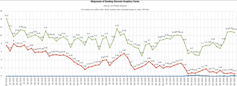 Dr. Jon Peddie, President of Jon Peddie Research, explained, "The AIB market is primarily supported by gamers, but it is currently being squeezed from the low-end market due to powerful new laptops and CPU integrated graphics; at the same time, the high-end market is also being squeezed due to competition (supply and demand), rising memory prices, and the fluctuating tariff policies of the Trump administration."